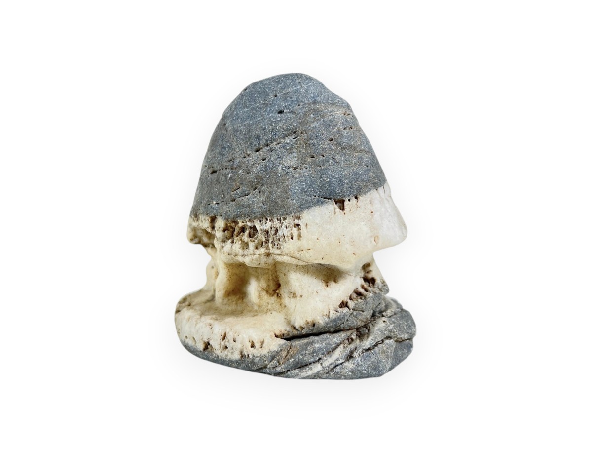 Questo suiseki giapponese presenta una forma naturale che richiama una piccola capanna: la parte superiore, di colore grigio scuro e conico, evoca un tetto spiovente, mentre la fascia centrale più chiara, suggerisce l'idea delle pareti. Le incavature ricordano l'ingresso e delle finestre, accentuando ulteriormente la somiglianza con un'abitazione rurale. La texture ricca di dettagli e i contrasti cromatici esaltano l’impressione di una costruzione antica, consumata dal tempo e dagli elementi.