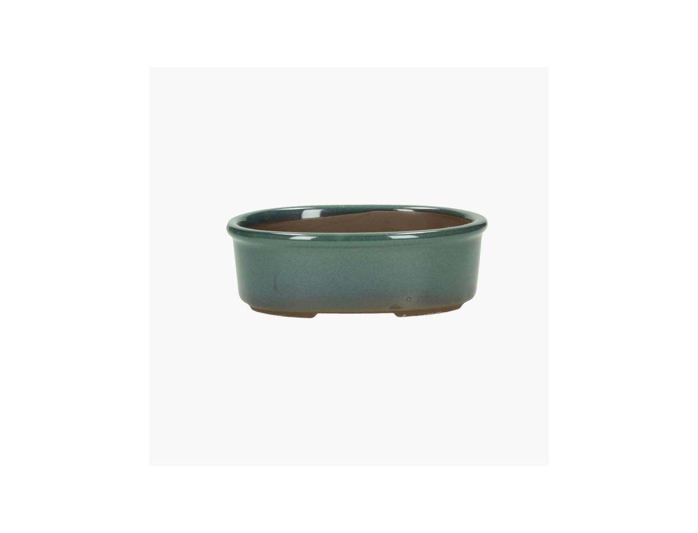 Vaso per bonsai giapponese, ovale, in grès smaltato colore verde.Le misure esterne di 15x11,5xh6 cm, lo rendono ideale per bonsai di piccole dimensioni.
