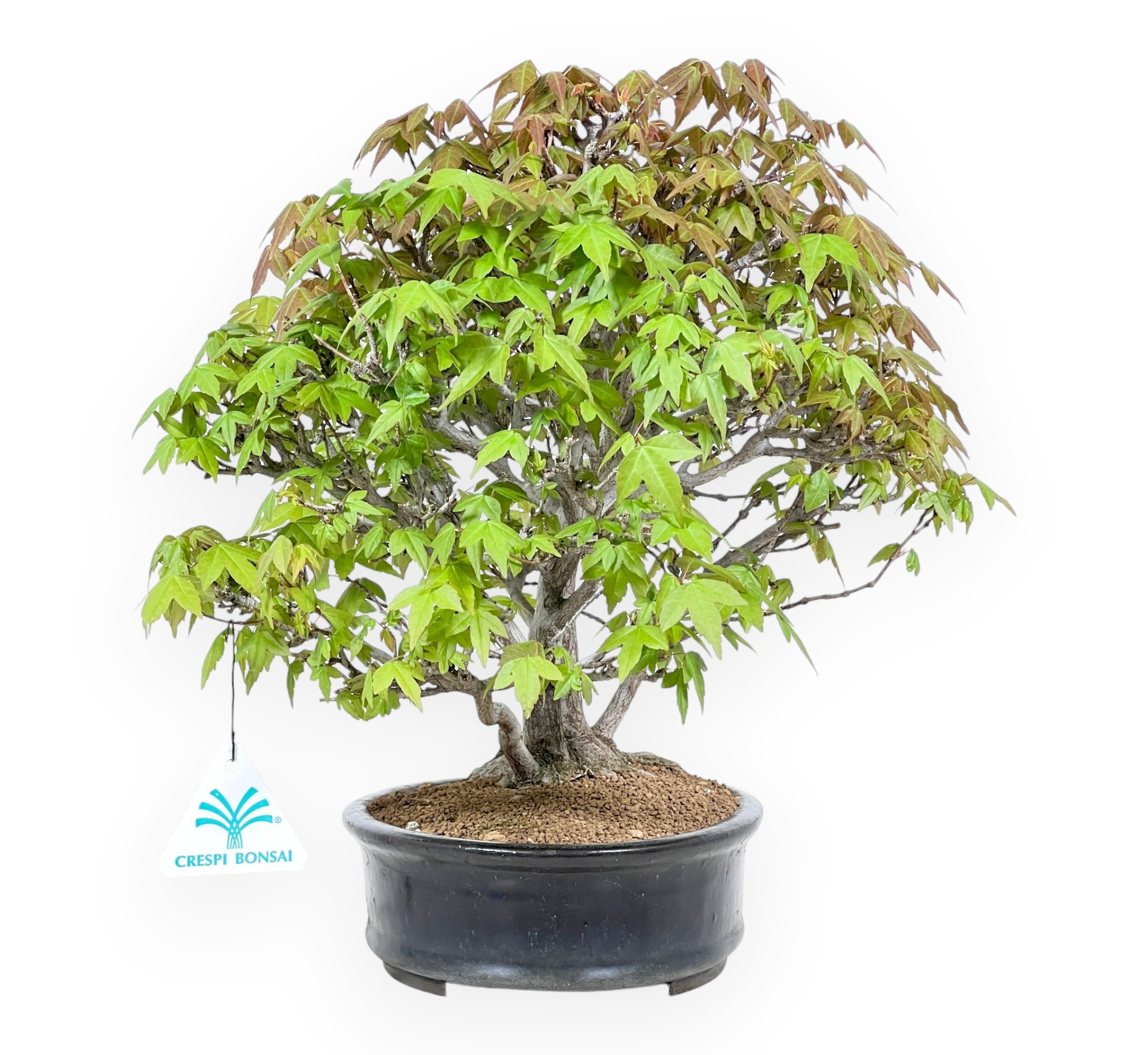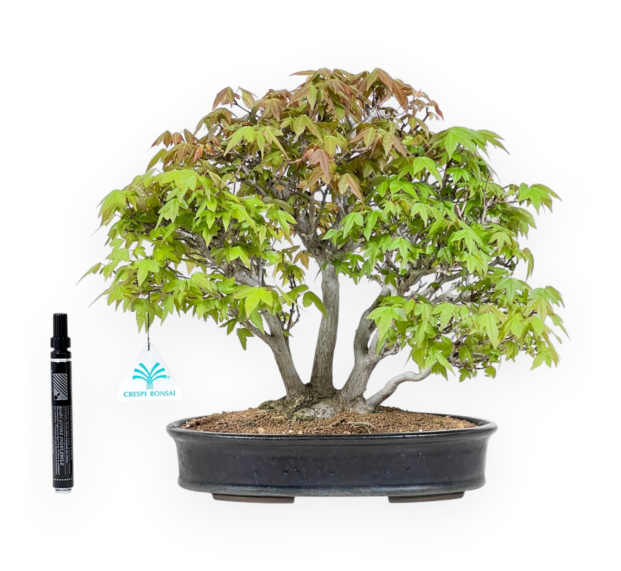 Bonsai shohin van Acer buergerianum (esdoorn), een bladverliezende soort, wordt gewaardeerd om zijn opvallende gebladerte dat een spectaculaire variatie aan kleuren biedt naarmate de seizoenen vorderen. In de lente en zomer zijn de bladeren heldergroen, terwijl ze in de herfst rood en oranje kleuren, totdat de bonsaiboom in de winter zijn bladeren verliest. Hij heeft een boomstronkstijl (Kabudachi) waarbij alle stammen vanuit dezelfde basis groeien met een enkel wortelstelsel, waardoor het in alle opzichten een enkele boom is. Gekweekt in een ovale blauw geëmailleerde aardewerken pot, creëert hij een elegant contrast met het gebladerte.
