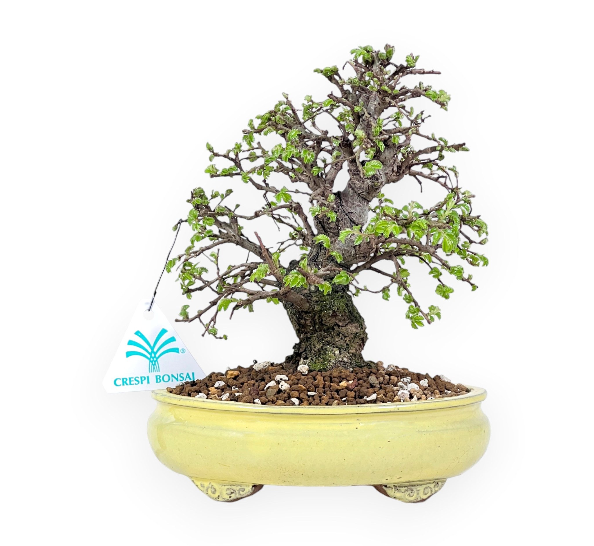 De Ulmus Parviflora (iep) bonsaiboom is een bladverliezende soort die zeer gewaardeerd wordt in het bonsaiwereldje vanwege zijn winterhardheid, harmonieuze groei en dichte vertakking. Het compacte en evenwichtige gebladerte dat bestaat uit kleine getande blaadjes geeft de bonsaiboom een volwassen en rijk karakter. Het blad kleurt oranjegeel in de herfst en verliest zijn bladeren in de winter. Dit exemplaar heeft een zeer robuuste en oud uitziende stam met een bochtige en elegante ontwikkeling. De bonsai is gekweekt in een ovale pot van geel geglazuurd steengoed en is perfect om de heldere kleuren van de bladeren en de donkere kleur van de stam te benadrukken.