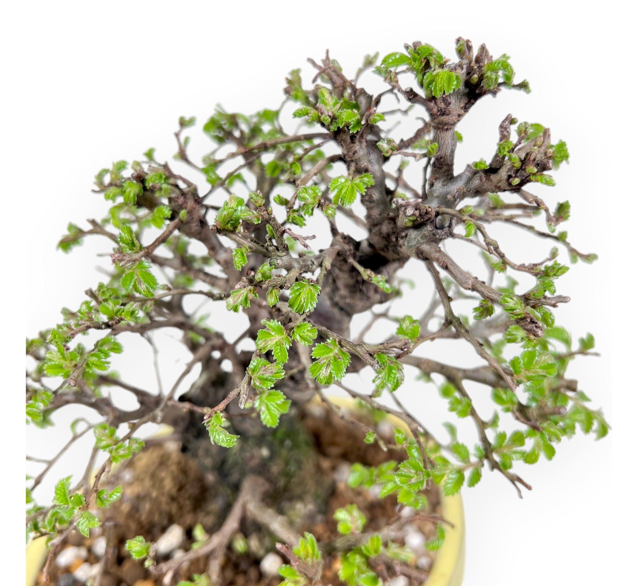 Iepenbonsai gekenmerkt door zijn hoogte zonder pot van 16 cm, stamomvang van 0,9 cm en nebari van 3 cm. De plant staat in een ovale geglazuurde steengoed pot met afmetingen 15,5x12xH5 cm.