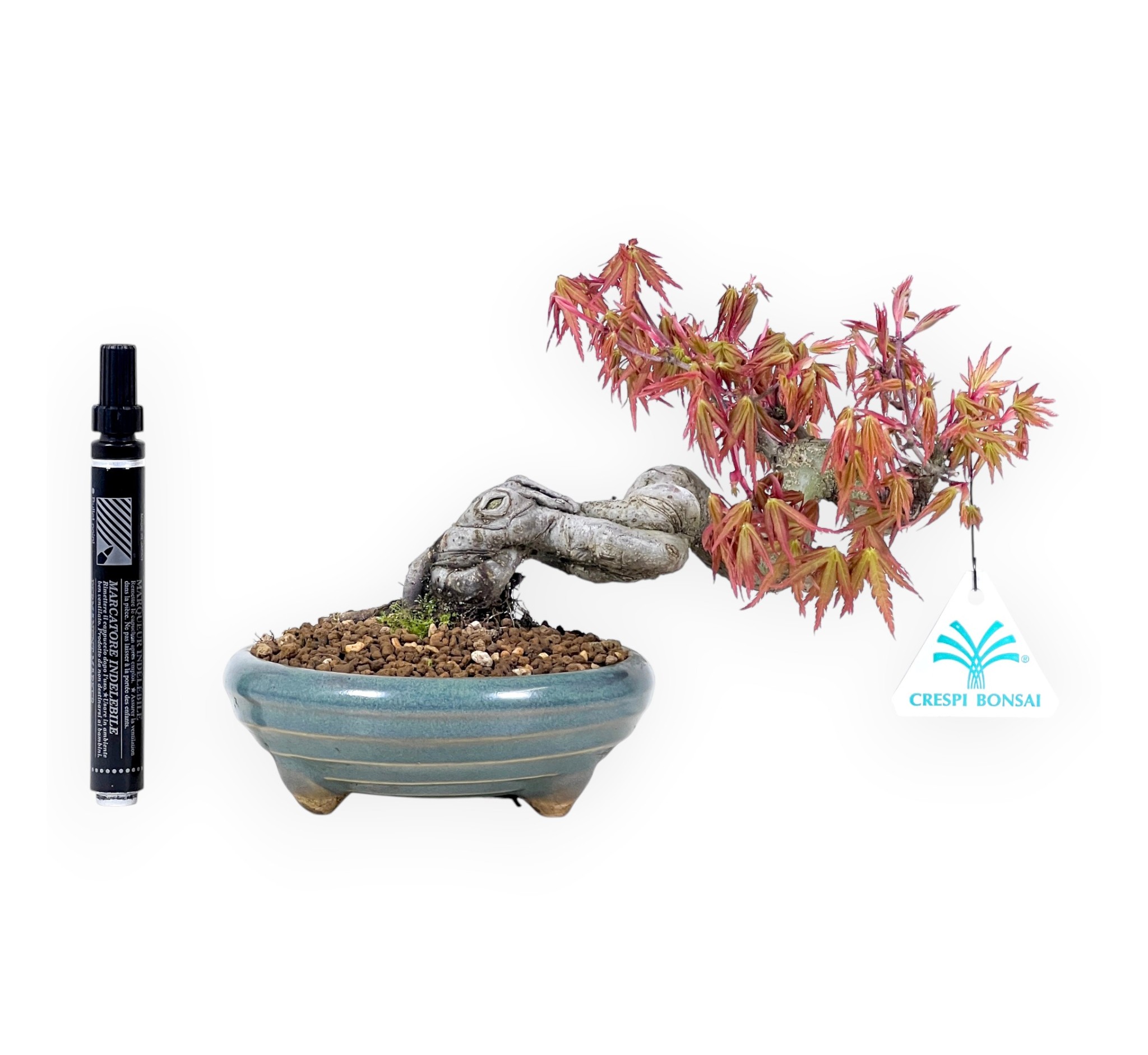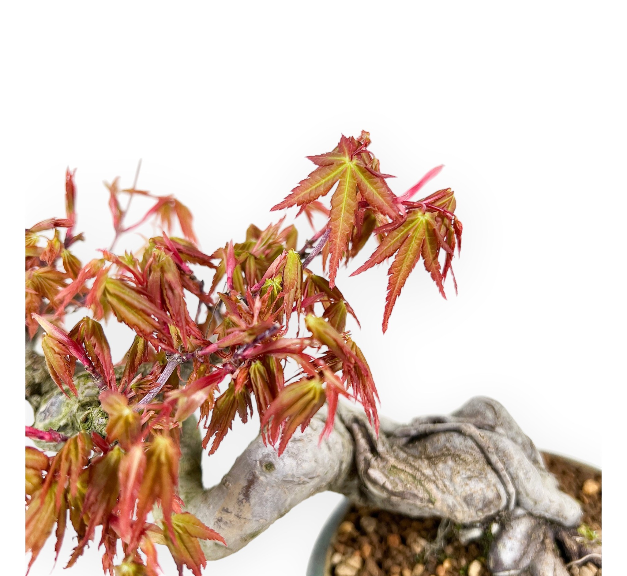 Deze shohin bonsai van Acer palmatum (esdoorn) is een bladverliezende soort, gewaardeerd om zijn prachtige gebladerte dat met de seizoenen van kleur verandert, van diepgroen naar schakeringen van oranjegeel tot dieprood in de herfst, en zijn bladeren verliest in de winter. Hij heeft een blootliggende wortelstijl (neagari) met een kronkelige, aflopende stamstructuur die een sculpturaal, dynamisch effect creëert en de schoonheid van de wortels benadrukt. Hij wordt gekweekt in een ronde, groen geëmailleerde aardewerken pot om de wortels te benadrukken en een elegant contrast met het gebladerte te creëren.