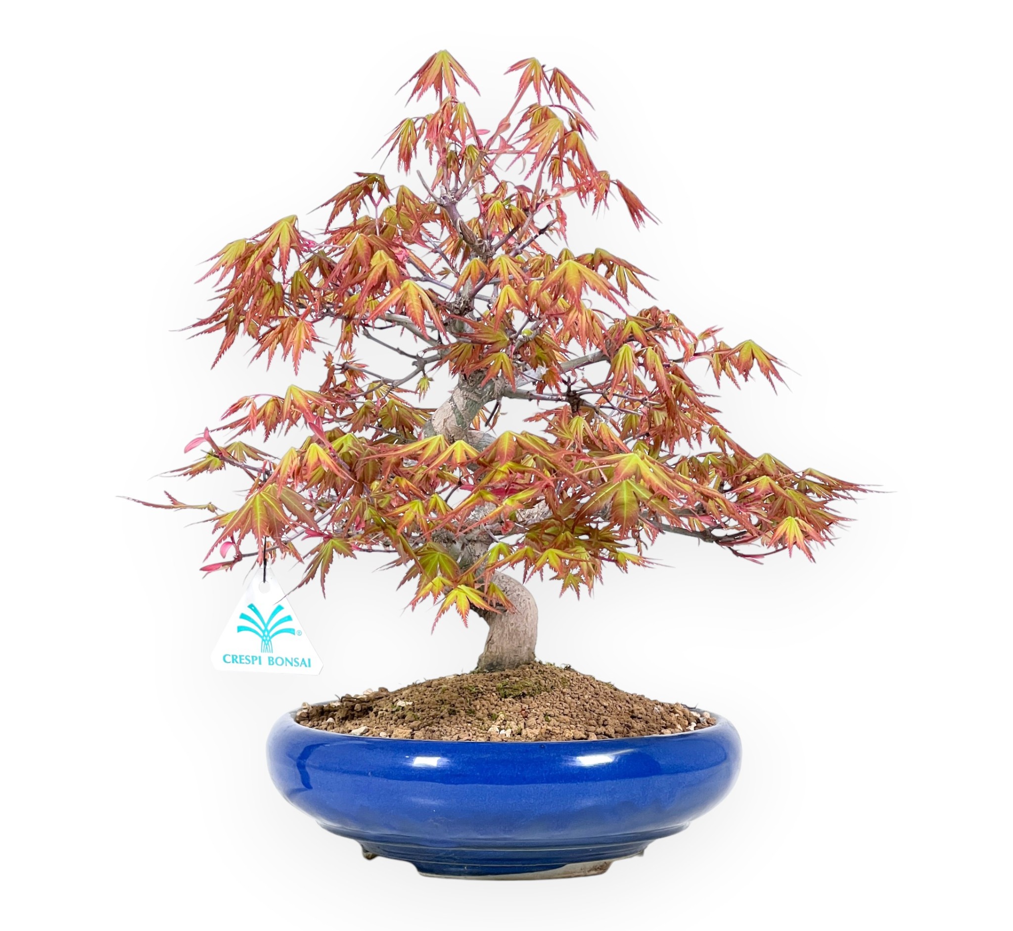 Deze bonsai van Acer palmatum (Japanse esdoorn) is een bladverliezende soort die zeer gewaardeerd wordt om zijn delicate en fijn gegraveerde gebladerte, dat zich in het voorjaar presenteert met levendige geeloranje tinten, in de loop van het seizoen evolueert naar intensere en warmere kleuren in de herfst en vervolgens in de winter zijn bladeren verliest. De boom wordt gekenmerkt door een kronkelige, harmonieuze stam die zich met elegante bewegingen ontwikkelt en de plant dynamiek en natuurlijkheid geeft. De vertakking is goed verdeeld en zorgt voor een compact maar licht bladerdak, met netjes gerangschikte geweien die de fijnheid van de bladeren versterken. Hij wordt gekweekt in een ronde, diepblauw geglazuurde keramische pot die een verfijnd kleurcontrast creëert met de bladtinten en bijdraagt aan de algehele elegantie van de bonsai.