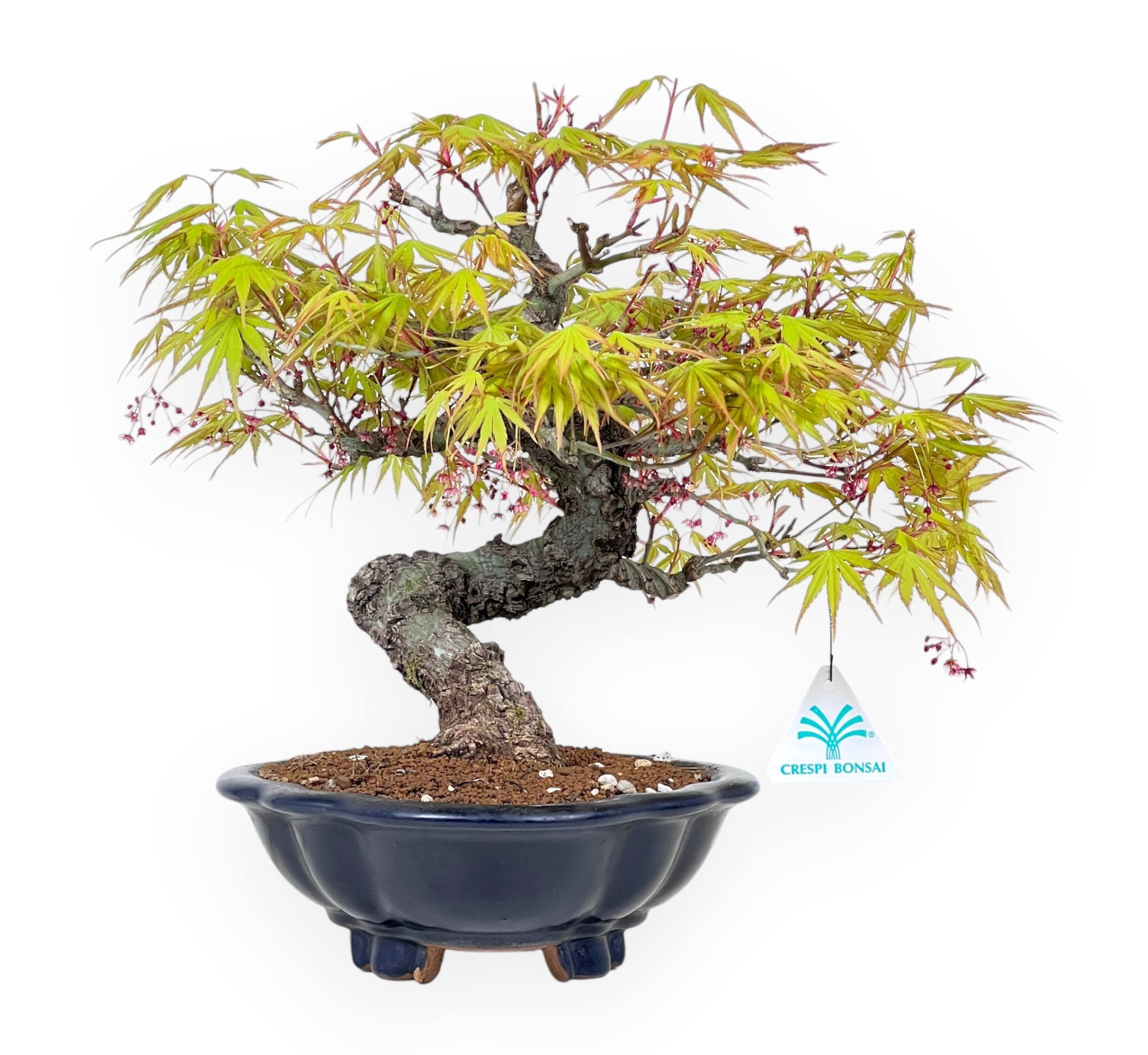 Deze bonsai van Acer palmatum Arakawa is een bladverliezende soort die zeer gewaardeerd wordt om zijn delicate en fijn gegraveerde blad, dat zich in het voorjaar presenteert met levendige groengele tinten, in de loop van het seizoen evolueert naar intensere en warmere kleuren in de herfst en dan in de winter zijn bladeren verliest. De boom heeft een karakteristieke gerimpelde, corticale stam. De sterk gegroefde schors geeft een gevoel van volwassenheid en rustiekheid. Deze bonsai wordt gekenmerkt door een kronkelige, harmonieuze stam die zich met elegante bewegingen ontwikkelt, wat de plant dynamiek en natuurlijkheid geeft. De vertakking is goed verdeeld en zorgt voor een compact maar licht bladerdak met netjes gerangschikte geweien die de fijnheid van de bladeren versterken. Hij wordt gekweekt in een donkerblauw geglazuurde keramische wolkenpot, die een verfijnd kleurcontrast creëert met de bladtinten en bijdraagt aan de algehele elegantie van de bonsai.