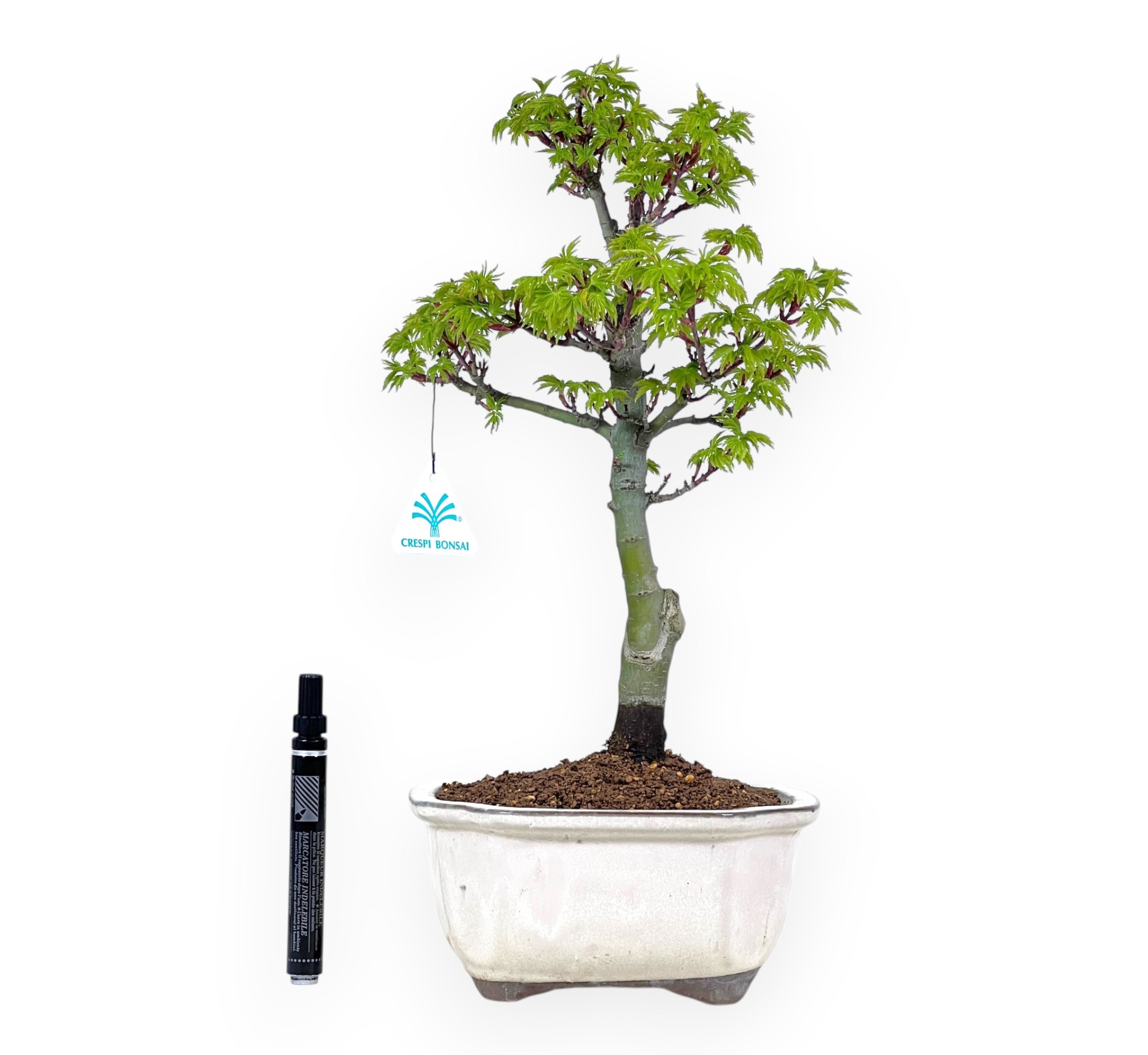 Esdoorn bonsai gekenmerkt door een hoogte zonder pot van 32,5 cm en een stamomvang van 2 cm. De plant staat in een rechthoekige geglazuurde steengoed pot met afmetingen 18x15xH8,5 cm.