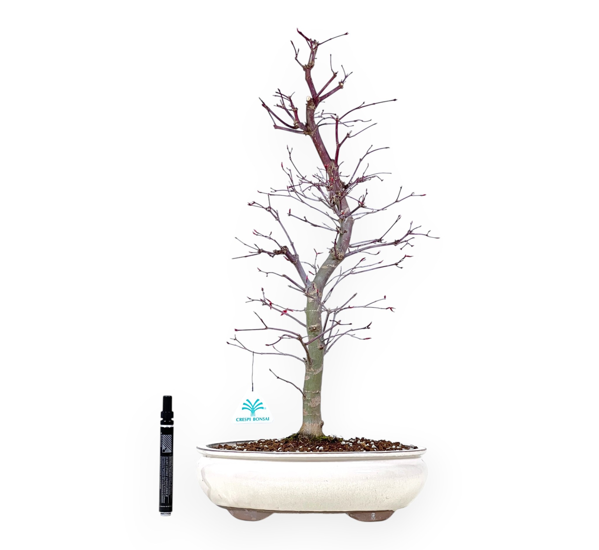 Esdoorn bonsai met een hoogte zonder pot van 49 cm, een stamdiameter van 2 cm en een nebari de 8 cm. De plant wordt gekweekt in een ovaal pot van geglazuurd steengoed met afmetingen 27x21xH8 cm.