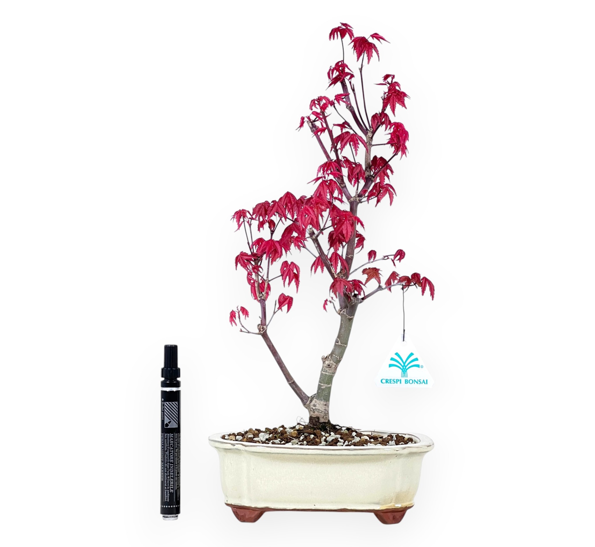 Esdoorn bonsai met een hoogte zonder pot van 33 cm, en een stamdiameter van 1,5 cm. De plant wordt gekweekt in een wolk pot van geglazuurd steengoed waarvan de afmetingen 17,5x13,5xH6 cm.