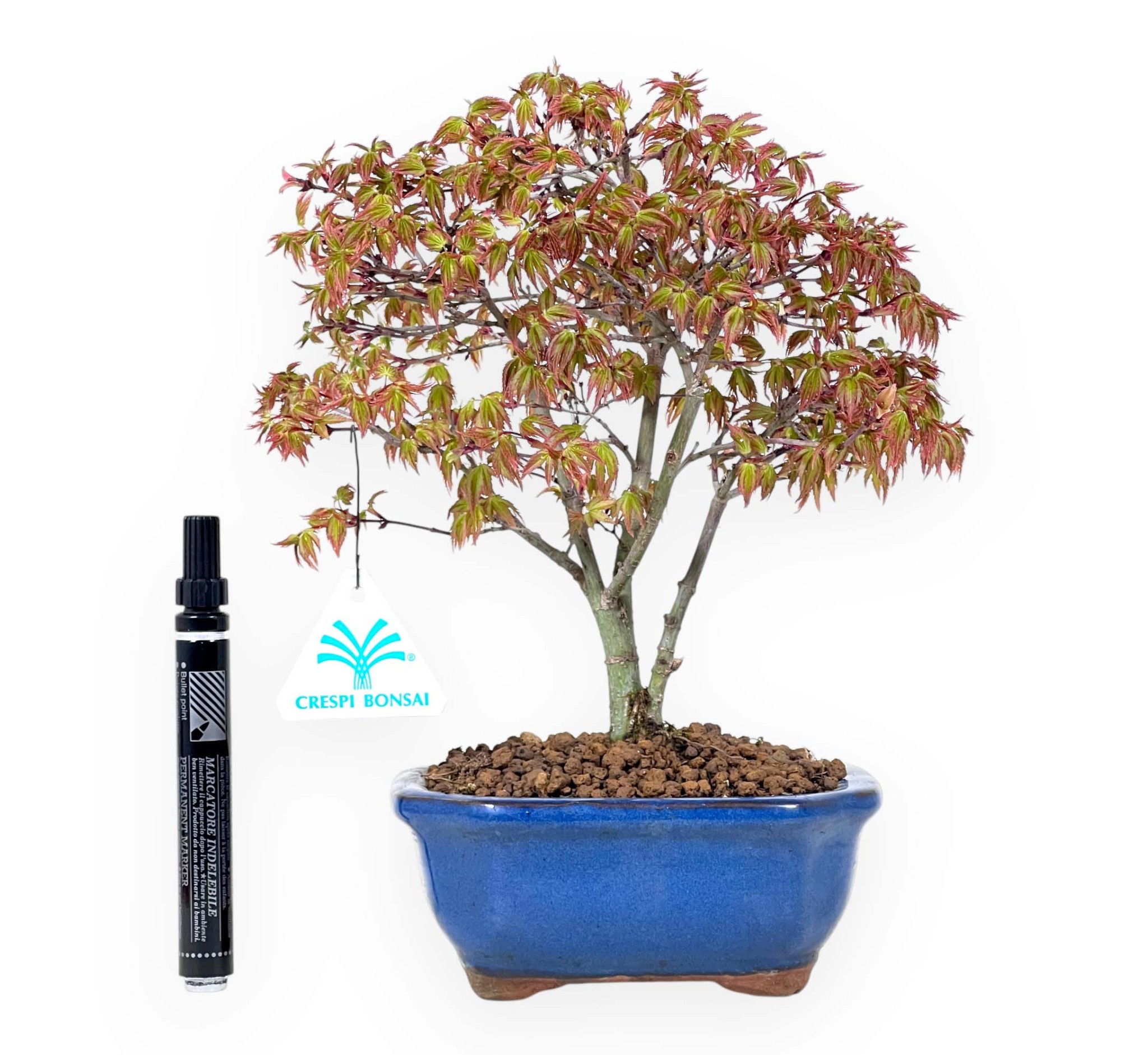 Bonsai van Acer palmatum kiyohime (esdoorn), een bladverliezende soort, die gewaardeerd wordt om zijn compacte groeiwijze en fijne vertakking. Het blad bestaat uit kleine, tere blaadjes die in de lente verschijnen met lichtgroene tinten met rode randen. In de herfst kleurt het spectaculair oranje en dieprood en in de winter verliest het zijn bladeren. Gezet in een multistam stijl, waarbij meerdere stammen zich vanuit dezelfde basis ontwikkelen, wat een evenwichtige en harmonieuze compositie creëert die de dichtheid van het gebladerte versterkt en de plant een grote visuele diepte geeft. Gecultiveerd in een rechthoekige blauw geglazuurd steengoed pot, met afgeronde hoeken, contrasteert hij elegant met de tinten van het gebladerte, wat de schoonheid ervan versterkt.