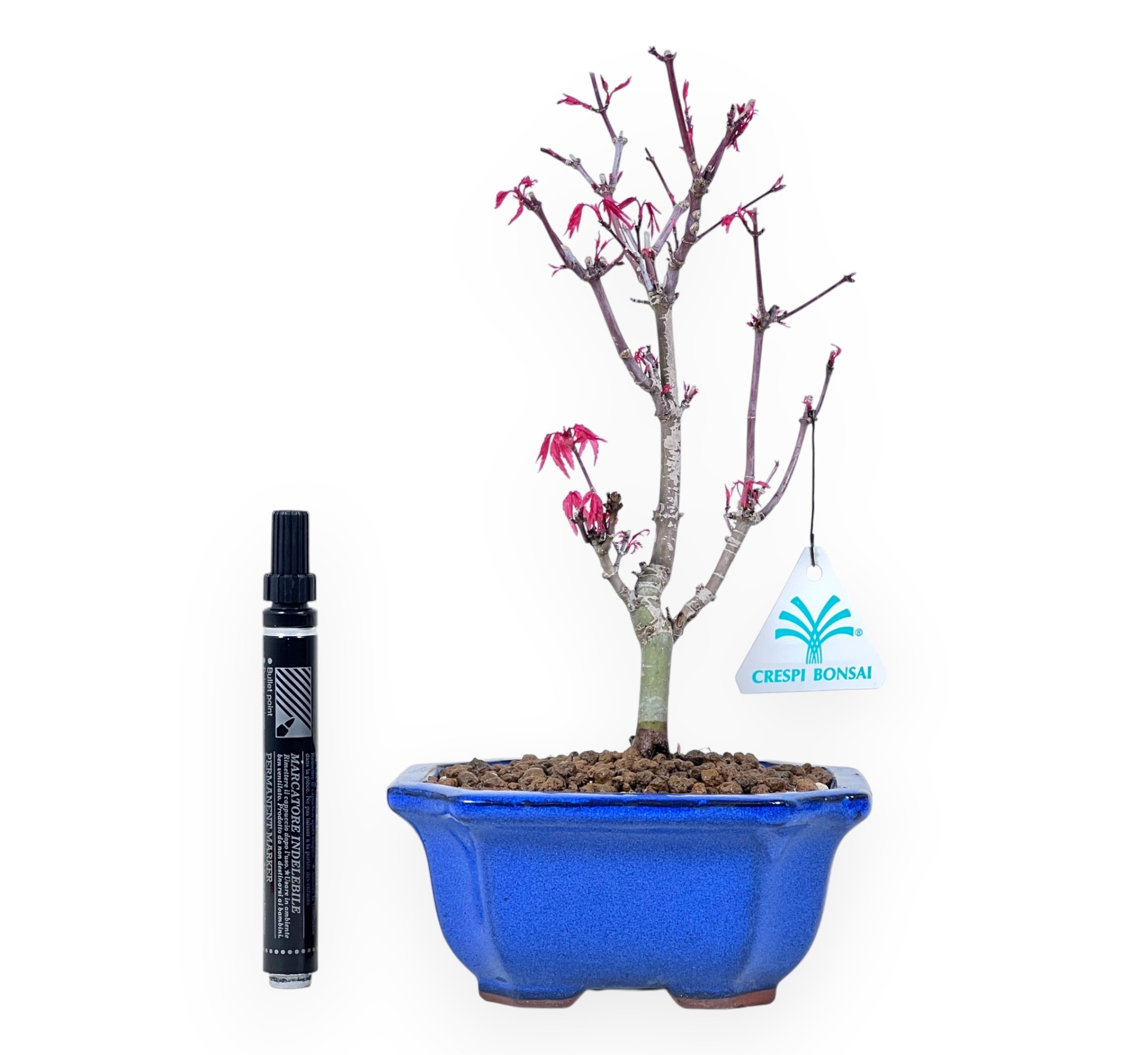 Esdoorn bonsai met een hoogte zonder pot van 20 cm, en een stamdiameter van 1 cm. De plant wordt gekweekt in een rechthoekig pot van geglazuurd steengoed met afmetingen 13x11xH6 cm.