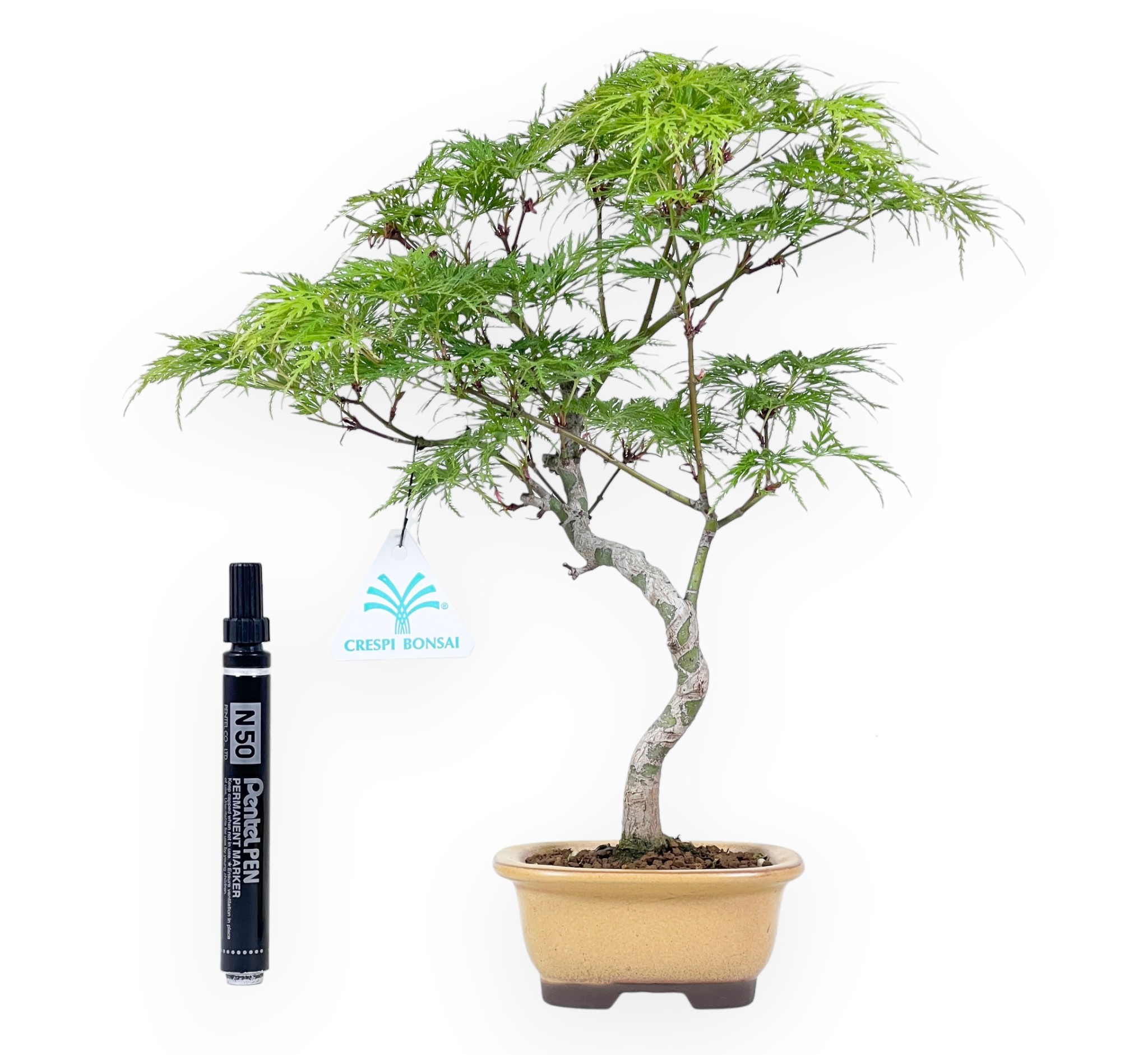 Bonsai van Acer palmatum (esdoorn), een bladverliezende soort, gewaardeerd om zijn handvormige bladeren met levendige seizoenstinten. Het heldergroene blad kleurt oranjegeel tot dieprood in de herfst en verliest zijn bladeren in de winter. Deze bonsai heeft een kronkelende stam die hem een natuurlijke en elegante uitstraling geeft, en dunne takken die naar boven vertakken. Gekweekt in een ovaal donker geel geglazuurde steengoed pot, is hij perfect om de felle kleur van de bladeren en de donkere kleur van de stam tot hun recht te laten komen.