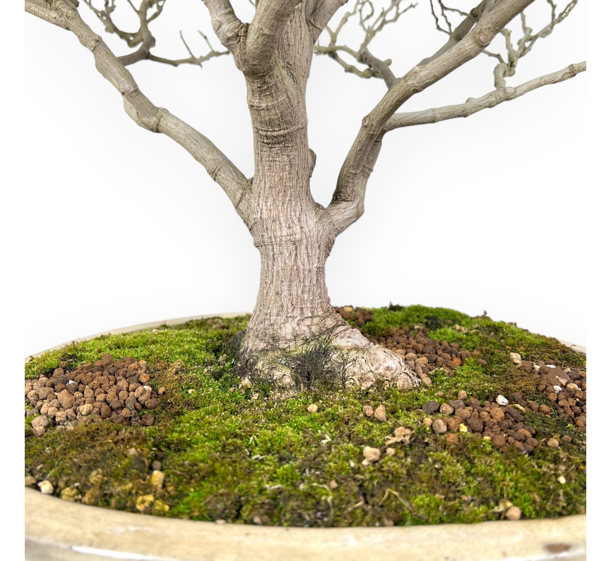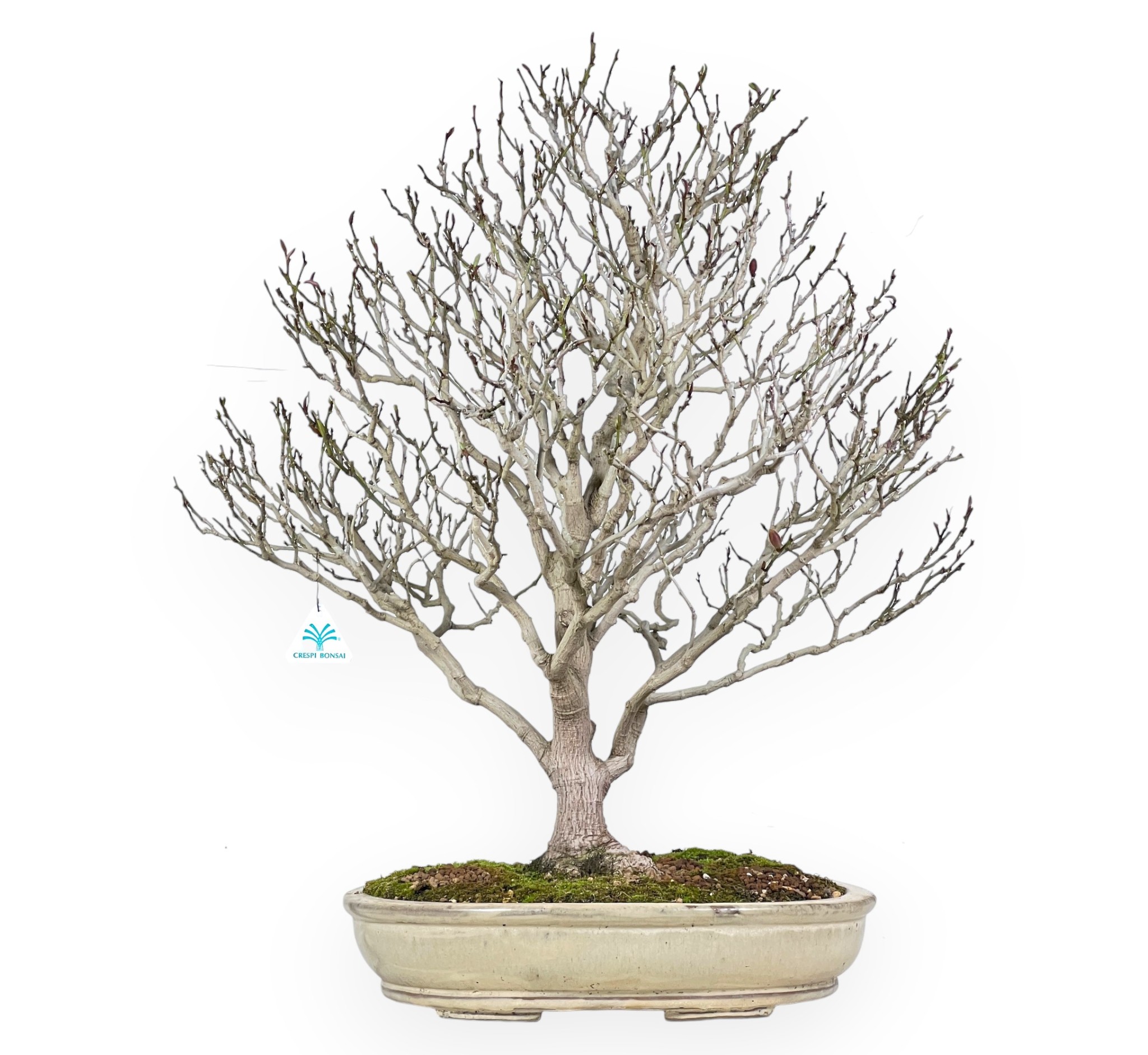 Uniek exemplaar Bonsai van Magnolia, een bladverliezende bloeiende bonsaiboom, geeft spectaculaire witte bloemen met een delicate geur in de lente. De bloei vindt meestal plaats tussen april en mei en zorgt voor een visueel spektakel dat deze bonsai nog meer fascineert. Het groene blad kleurt oranjegeel in de herfst en verliest zijn bladeren in de winter. De goed verdeelde vertakking geeft beweging en natuurlijkheid aan het silhouet. De stevige stam met een goede taps toelopende vorm straalt volwassenheid uit, terwijl de slanke, gelede takken een luchtig, evenwichtig bladerdak creëren. De ovaal crème geglazuurd steengoed pot, contrasteert elegant met de tinten van het gebladerte en de bloemen, waardoor hun schoonheid wordt benadrukt.