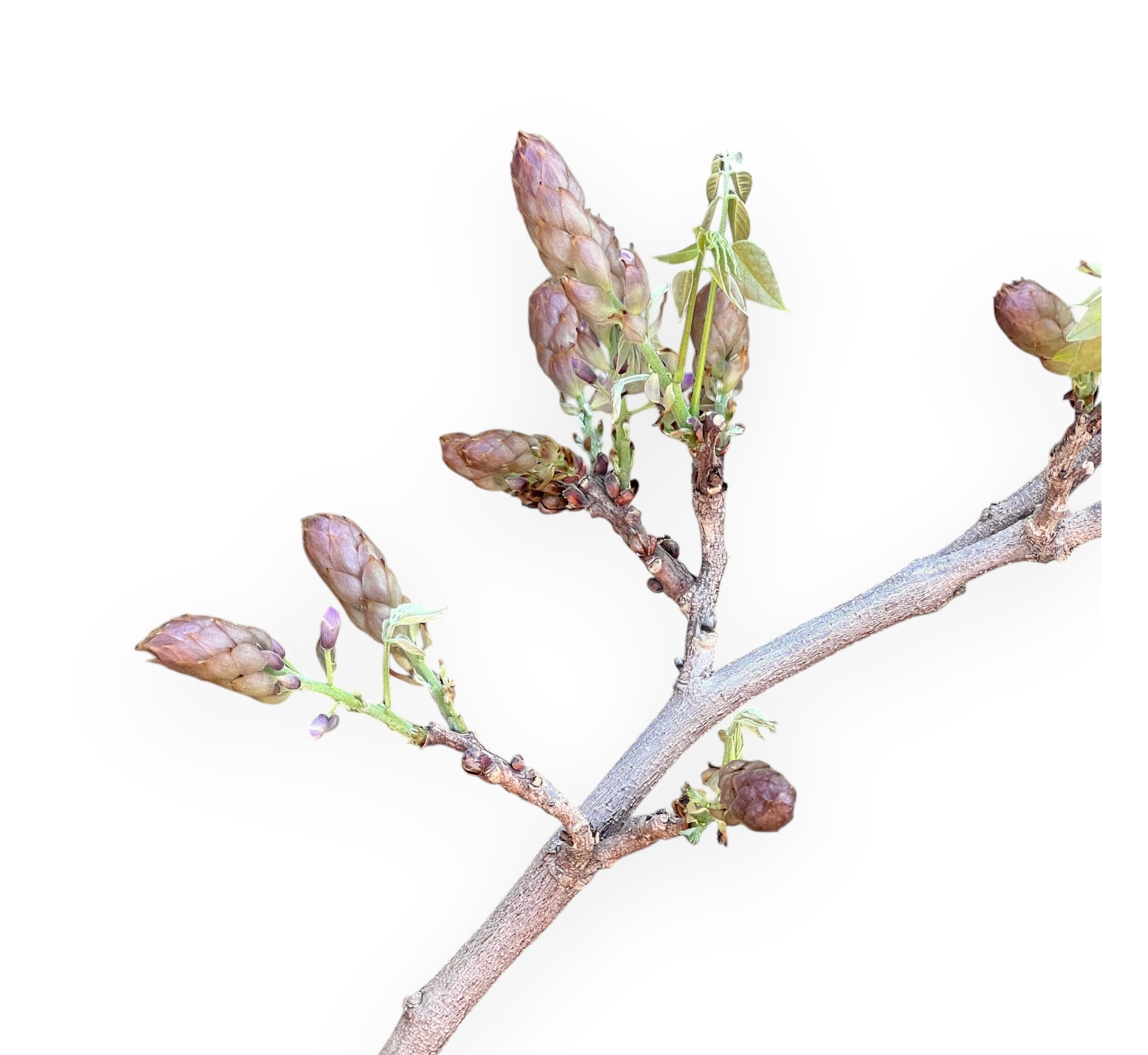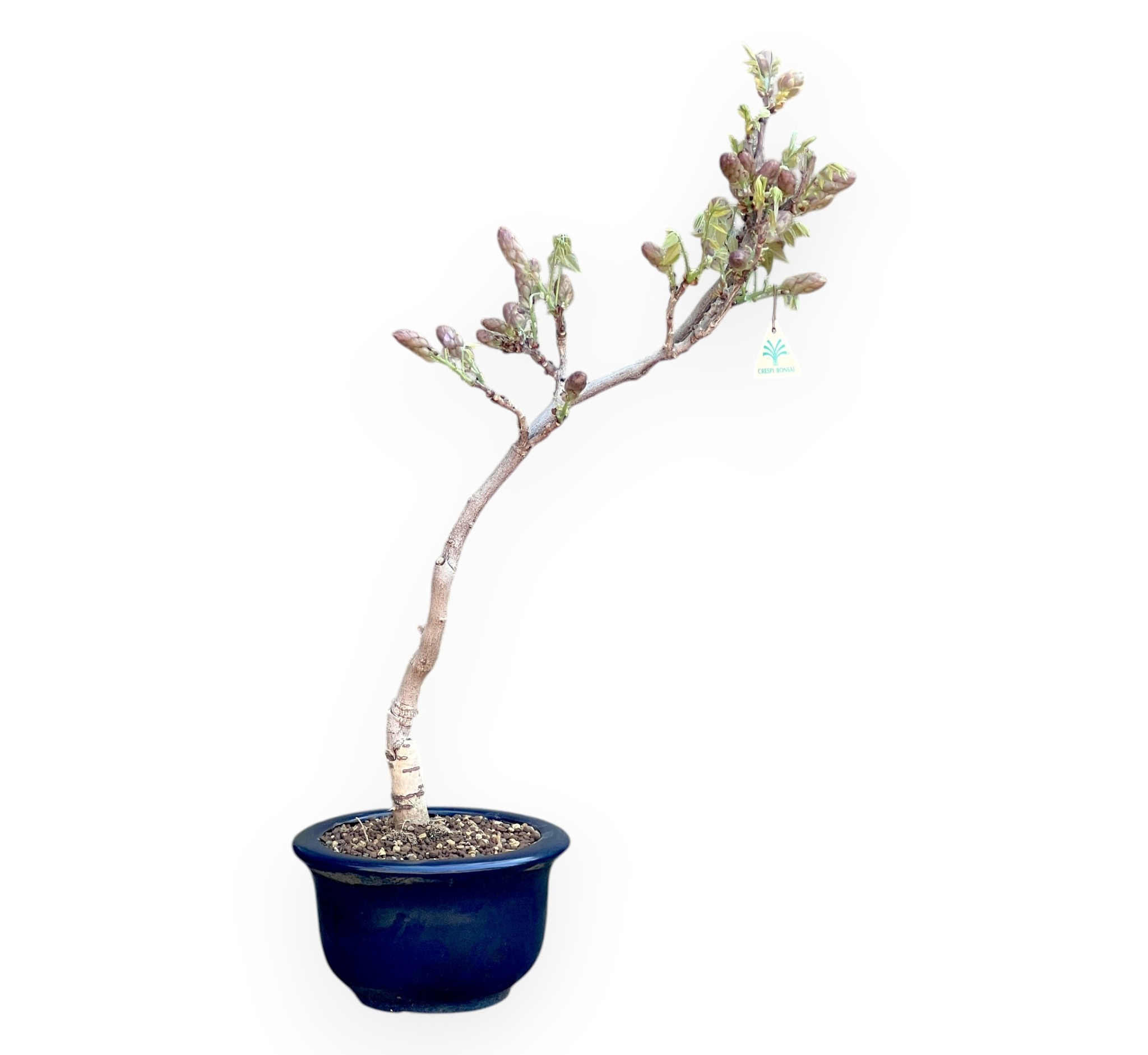 Bonsai van Wisteria floribunda, een bladverliezende bloemsoort die bekend staat om zijn spectaculaire voorjaarsbloei. In het voorjaar produceert hij de karakteristieke bloemknoppen, die zich voor of tegelijk met de bladeren ontwikkelen. De bloei is het meest spectaculaire moment: lange, hangende trossen geurige, violet-lila bloemen creëren een elegant, licht effect. De groene bladeren openen zich geleidelijk en begeleiden de bloei zonder deze ooit te overheersen. Tijdens de zomer, na de bloei, wordt de begroeiing dikker om een voller bladerdak te vormen, terwijl in de herfst de bladeren geel worden voordat ze vallen, waardoor de kale structuur van de bonsai weer zichtbaar wordt. Hij heeft een licht hellende stam, wat beweging geeft aan de compositie. Gekweekt in een rond blauw geglazuurde steengoed pot, die elegant contrasteert met de tinten van het gebladerte en herinnert aan de bloeiende tinten.