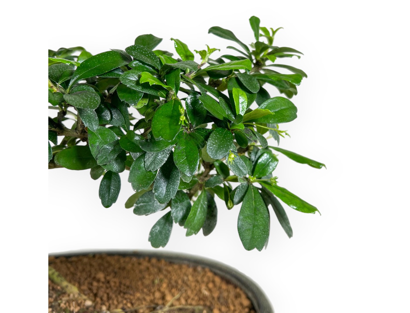 Deze bonsai van Carmona macrophylla (theeplant), behorend tot de groenblijvende binnen variëteit, wordt gewaardeerd om zijn kleine witte stervormige bloemen in de lente en zomer. Het blad, met glanzende, compacte bladeren, geeft hem een verfijnde uitstraling. De gestapeld stijl benadrukt de kronkelige stam en de goed gestructureerde vertakking. De boom is gekweekt in een ovaal olijfgroen geglazuurd steengoed pot, creëert het een kleurbalans die het glanzende gebladerte benadrukt zonder af te leiden van de vorm van de bonsai, terwijl de lage, ovale vorm de stabiliteit van de nebari en de algehele delicatesse van de compositie versterkt.
