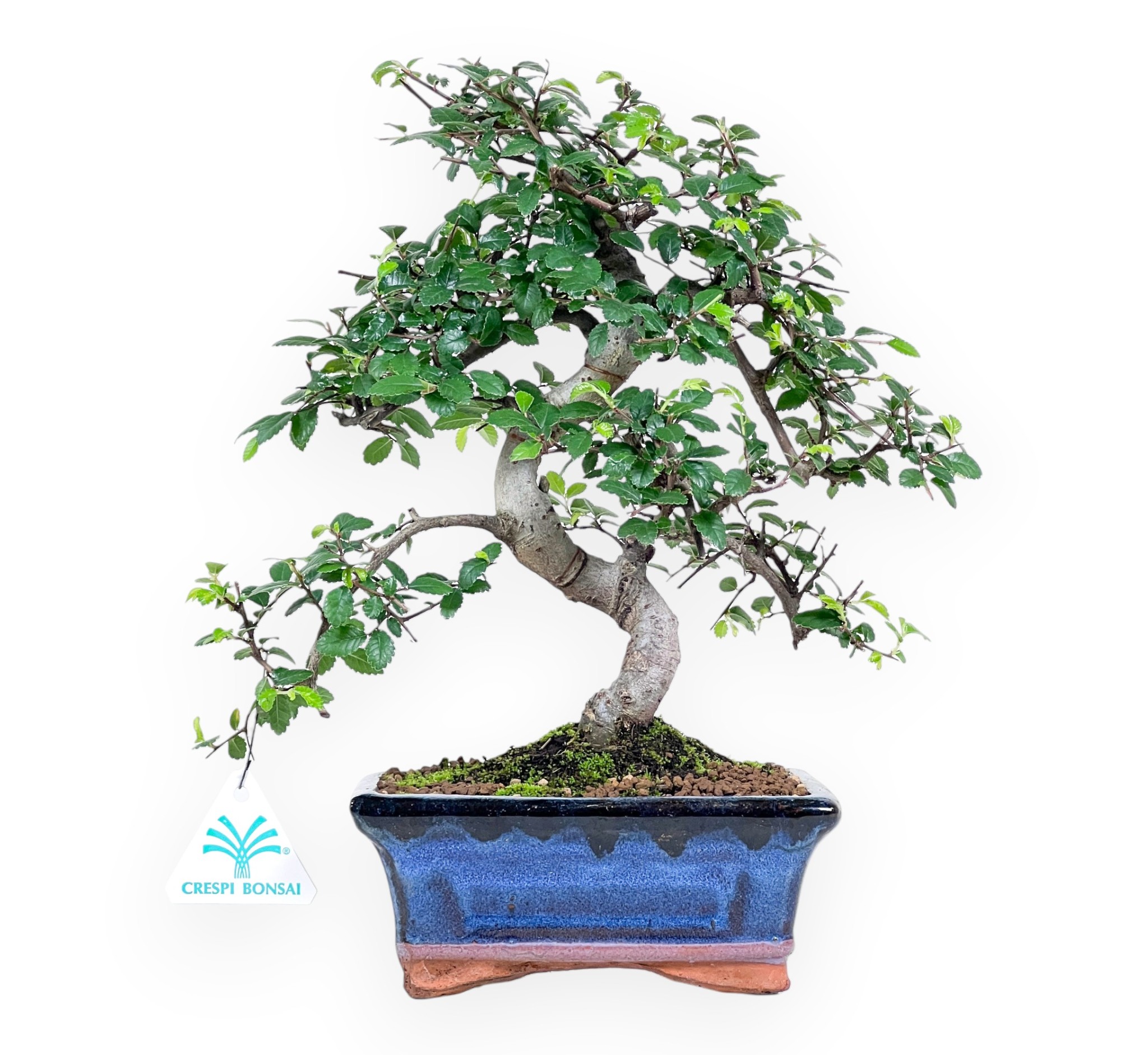 De Zelkova nire bonsai wordt gewaardeerd om zijn winterhardheid, aanpassingsvermogen en vegetatieve kracht. Hij onderscheidt zich door zijn kleine, diepgroene, gekartelde bladeren, die een compact en harmonieus bladerdek vormen dat elk detail van de structuur benadrukt. Dit exemplaar heeft een stam met een bochtige en goed geproportioneerde beweging, die een ordelijke vertakking ondersteunt die in staken is ontwikkeld. De solide en volwassen structuur drukt evenwicht en esthetische diepte uit. Hij staat in een rechthoekige blauw geglazuurde aardewerken pot die een elegant kleurcontrast vormt met het heldergroene gebladerte.