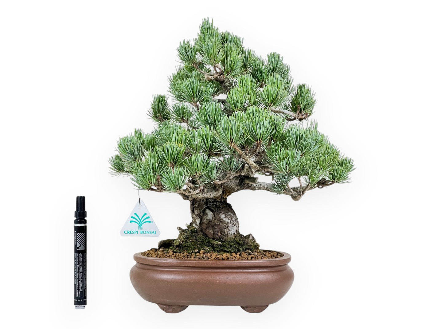 Deze bonsai van Pinus Pentaphylla (den met vijf naalden) is een gewaardeerde conifeer, zeer gewaardeerd in de bonsaikunst vanwege zijn elegante houding en duurzaamheid. De naalden zijn gegroepeerd in groepjes van vijf en blauwgroen van kleur. Naarmate de schors van deze soort ouder wordt, wordt hij interessanter. De shari stijl (Sharimiki) heeft het zichtbare gin op de takken en shari op de stam, wat de plant een uitstraling van oudheid en kracht geeft. Deze stijl mengt levend en dood hout, wat de kracht en schoonheid van de plant benadrukt. Gekweekt in een ovaal ongeglazuurde steengoed pot versterkt het rustieke van de stam en contrasteert met het heldere groen van de naalden.