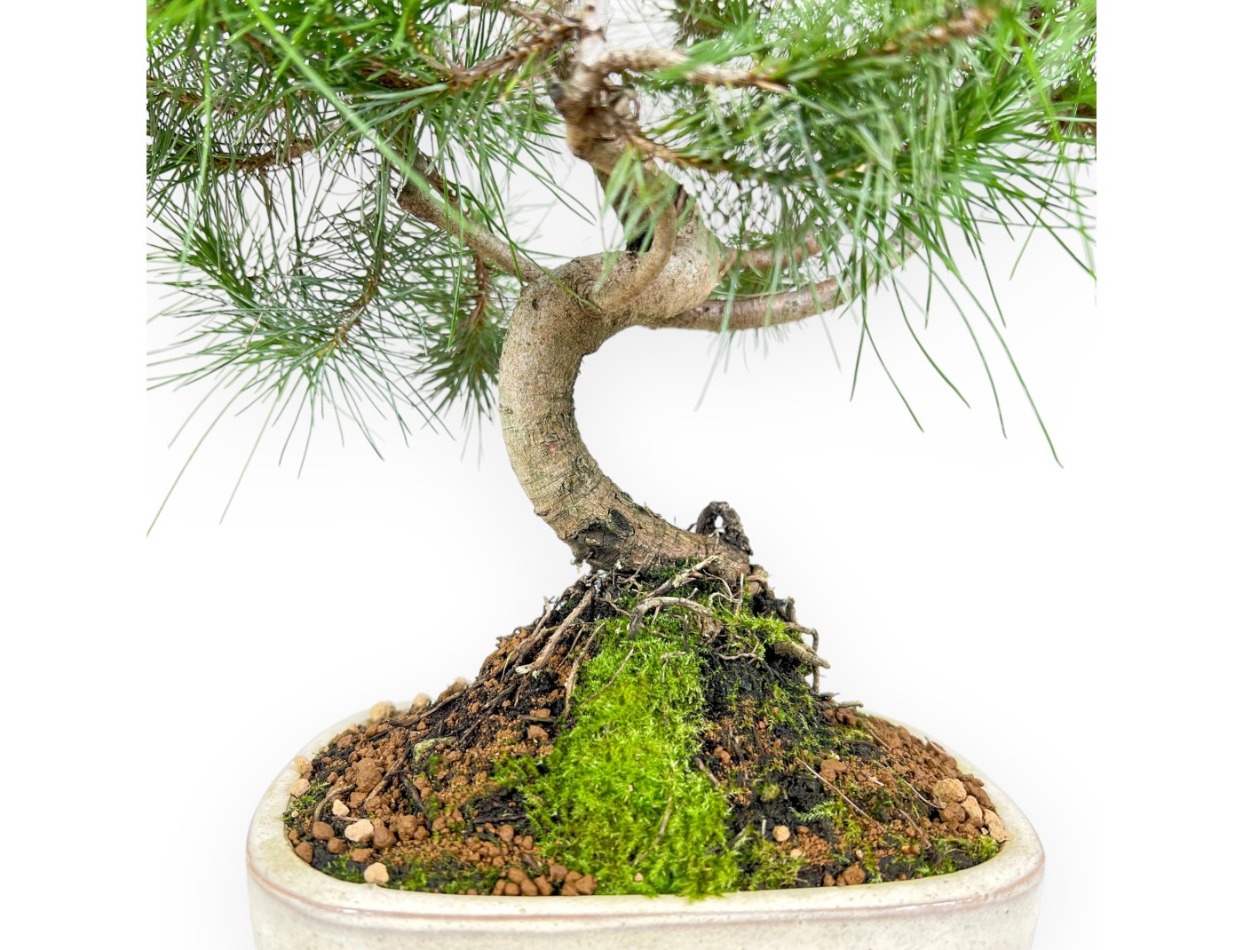 Dennen bonsai gekenmerkt door een hoogte zonder pot van 49 cm, stamomvang van 1,5 cm en nebari van 7 cm. De plant wordt gekweekt in een ovaal pot van geglazuurd steengoed waarvan de afmetingen 15,5x11,5xH7 cm.