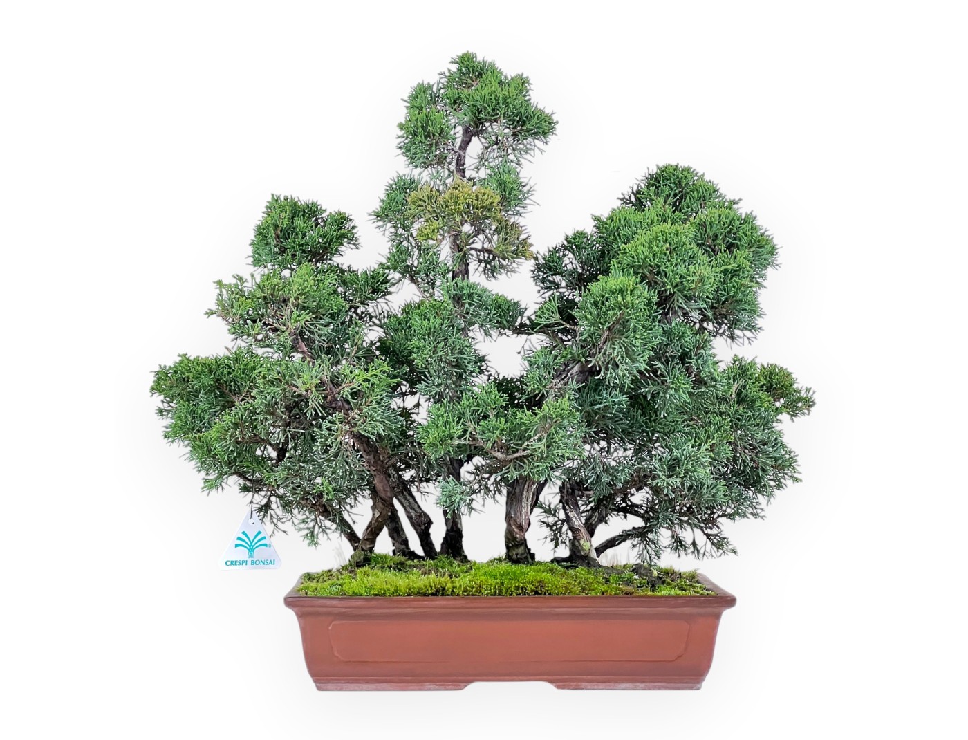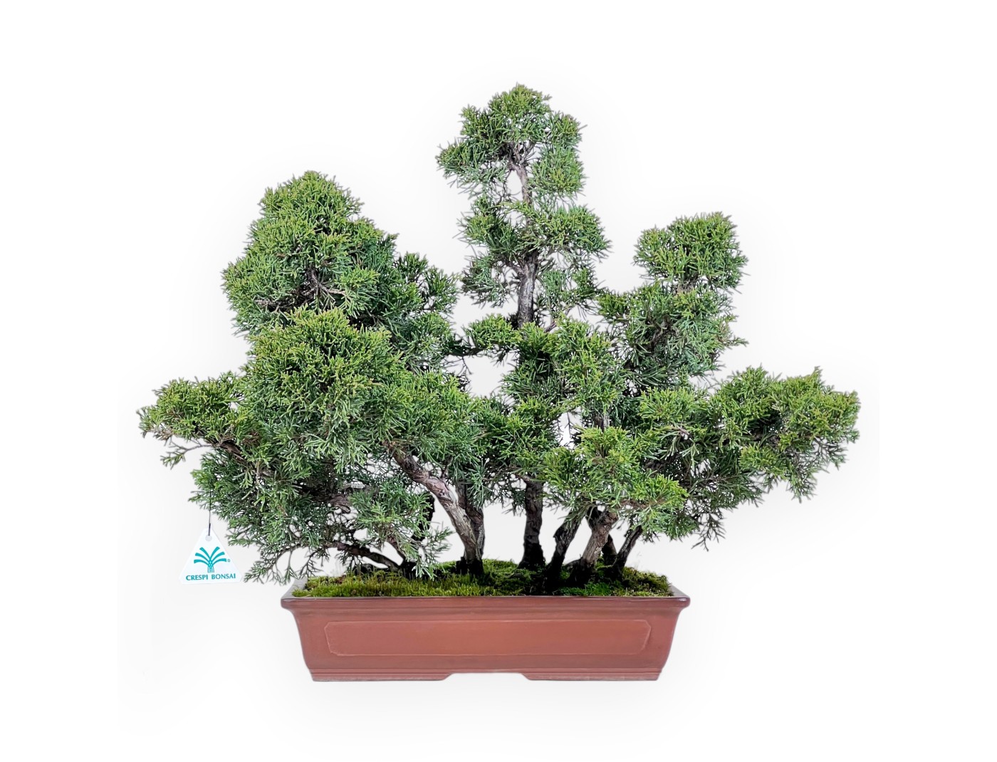 De bonsai van Juniperus chinensis (jeneverbes), een groenblijvende naaldboom, die gewaardeerd wordt om zijn elegantie, robuustheid en weerstand tegen verschillende omstandigheden. De kroon heeft een compacte vertakking met een intens groene kleur, en slanke goed proportionele stammen. De bonsai is gekweekt in vlot stijl (Ikadabuki) en heeft een gezamenlijke basis waaruit meerdere slanke stammen groeien, die het beeld van een klein miniatuurbosje oproepen. De bonsai gekweekt in een rechthoekige ongeglazuurde steengoed pot, die de schoonheid van de bonsai benadrukt en hem een dynamisch en verfijnd uiterlijk geeft.
