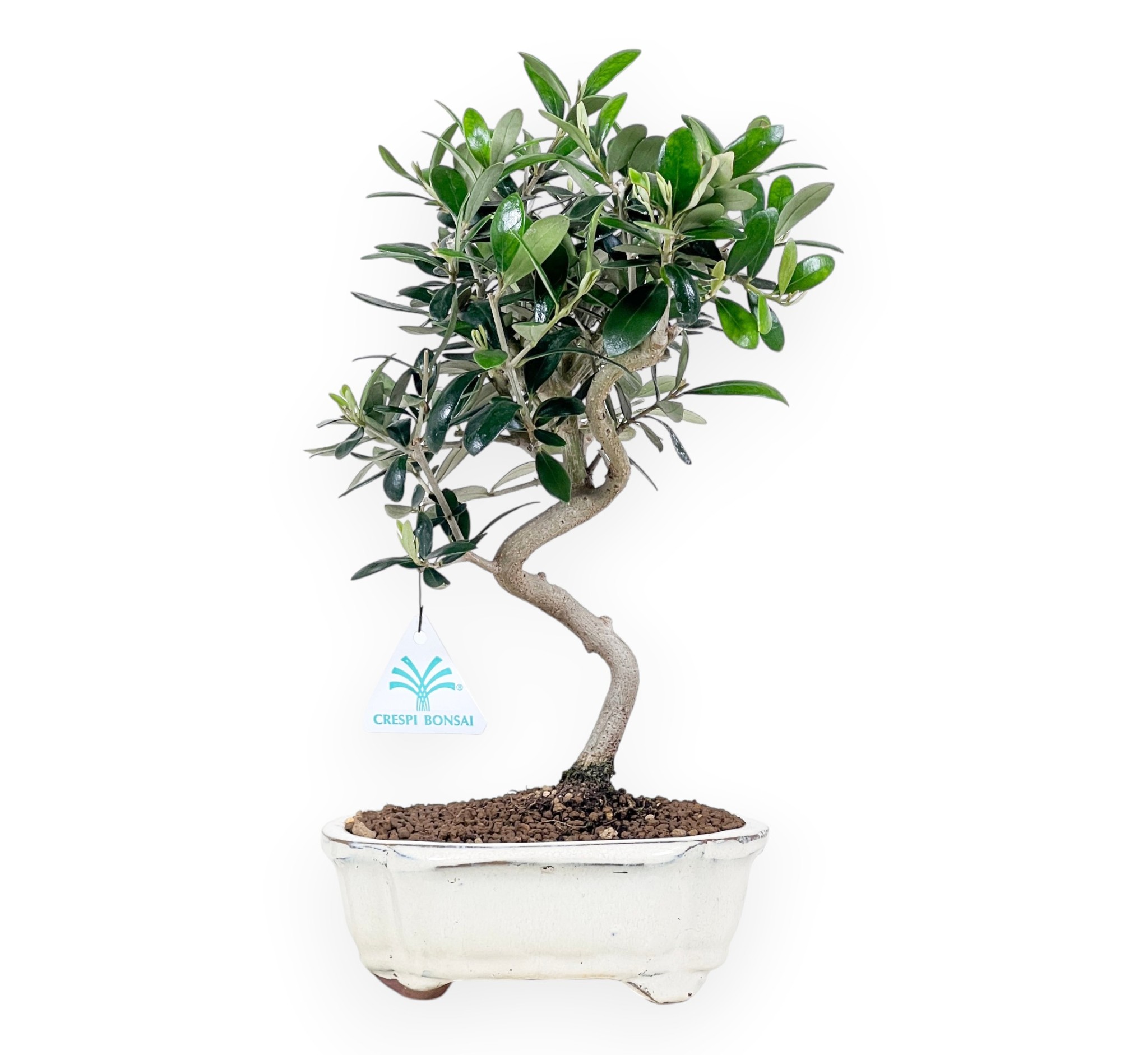 De Olea europaea (Olijfboom) bonsai is een groenblijvende plant met mediterrane charme, gewaardeerd om zijn diepgroene, leerachtige blad met zilverkleurige accenten en elegante, harmonieuze groeiwijze. In de lente kan hij een delicate witte bloesem geven, soms gevolgd door de productie van kleine sierolijven. Dit exemplaar onderscheidt zich door zijn slanke stam met bochtige S-vormige beweging, wat hem dynamiek en lichtheid geeft. Het compacte en goed geproportioneerde gebladerte is netjes gestructureerd met evenwichtige takken die de lijn van de stam versterken en een verfijnd en natuurlijk geheel vormen. Gekweekt in een wolkenpot van crèmekleurig geglazuurd steengoed, versterkt het de elegantie van de plant en benadrukt het contrast tussen de lichtgekleurde bast en het glanzende gebladerte.