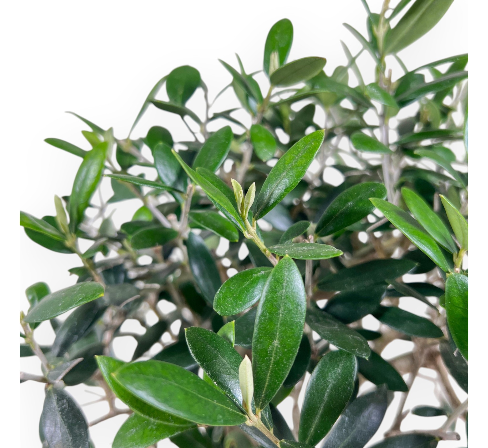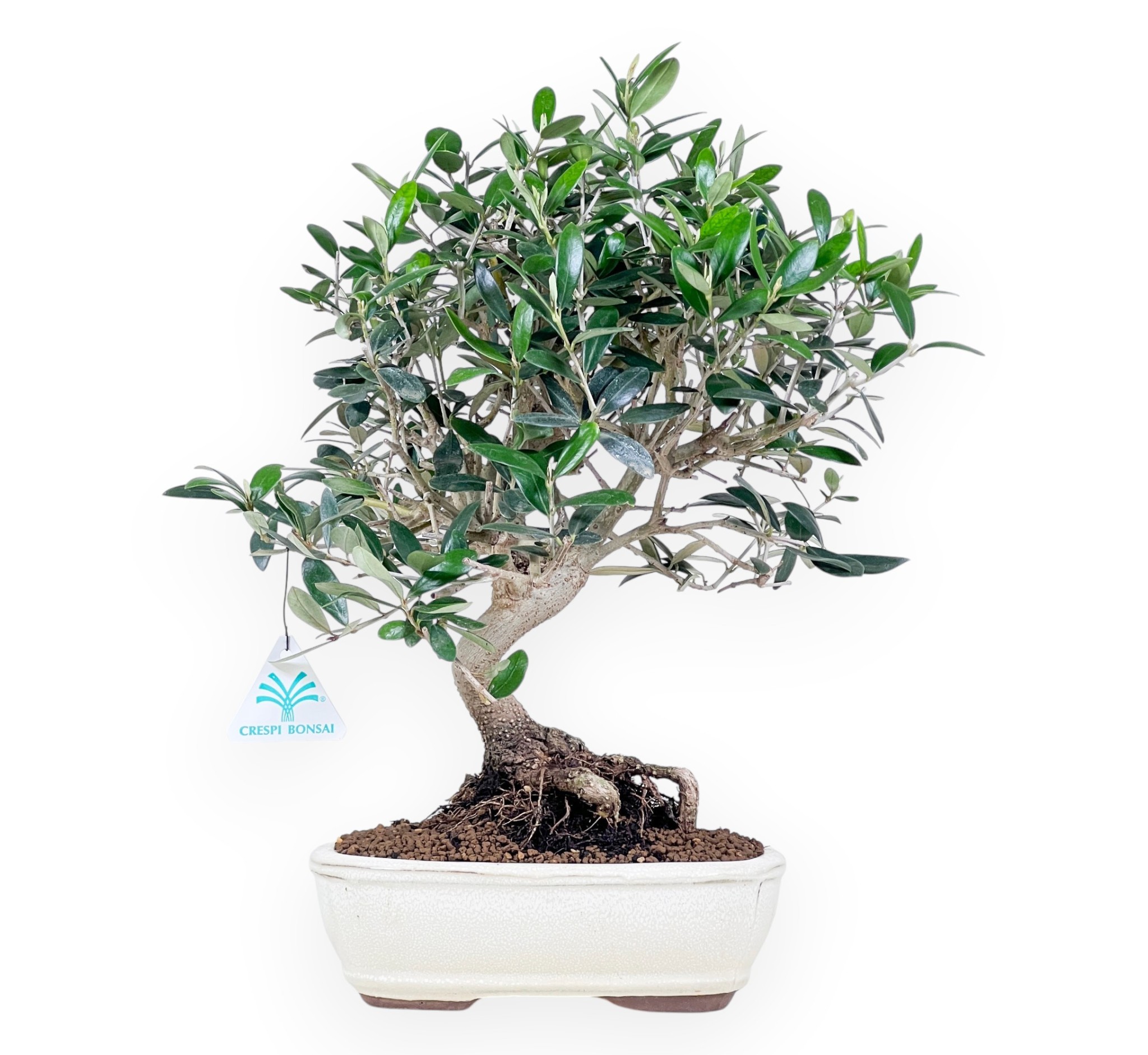 De Olea europaea (Olijfboom) bonsai is een groenblijvende plant met mediterrane charme, gewaardeerd om zijn diepgroene, leerachtige blad met zilverkleurige accenten en elegante, harmonieuze groeiwijze. In de lente kan hij een delicate witte bloesem geven, soms gevolgd door de productie van kleine sierolijven. Dit exemplaar onderscheidt zich door zijn slanke stam met kronkelende S-vormige beweging, die hem dynamiek en kracht geeft, ook geaccentueerd door zijn goed ontwikkelde nebari. Het compacte en goed geproportioneerde gebladerte is netjes gestructureerd met evenwichtige takken die de lijn van de stam versterken en een verfijnd en natuurlijk geheel vormen. Gecultiveerd in een crèmekleurige geglazuurde steengoed ovale pot, versterkt het de elegantie van de plant en benadrukt het contrast tussen de bleke bast en het glanzende gebladerte.