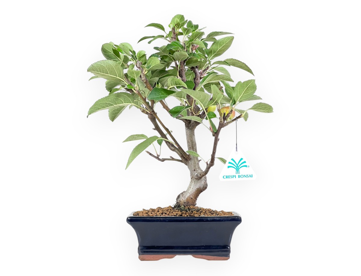 Deze bonsai van de Malus Domestica (appelboom) behoort tot de bladverliezende fruitvariëteiten en wordt gewaardeerd om zijn roze-witte voorjaarsbloesem en de daaropvolgende productie van kleine appels, die van geelgroen naar rood verkleuren als ze rijp zijn, wat karakter geeft aan de boom. Het blad kleurt oranjegeel in de herfst en verliest zijn bladeren in de winter. De donkerblauw rechthoekige geglazuurd steengoed contrasteert elegant met het diepgroene gebladerte.