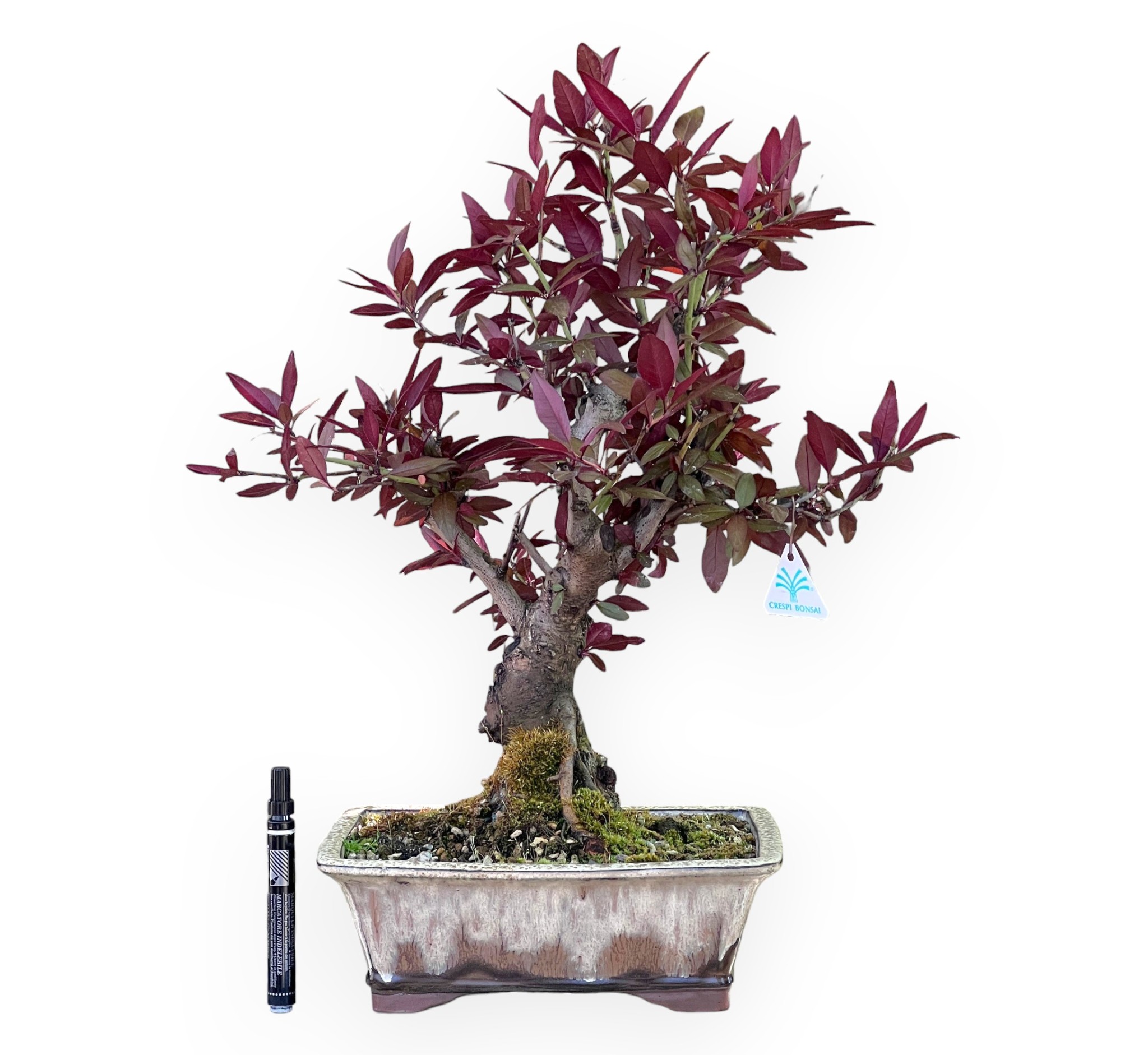 Bonsai van Prunus persica gekenmerkt door een hoogte zonder pot van 48 cm, een stamomvang van 5 cm en een nebari van 11 cm. De plant wordt gekweekt in een rechthoekige pot van geglazuurd steengoed waarvan de afmetingen 25,5x20,5xH9 cm.