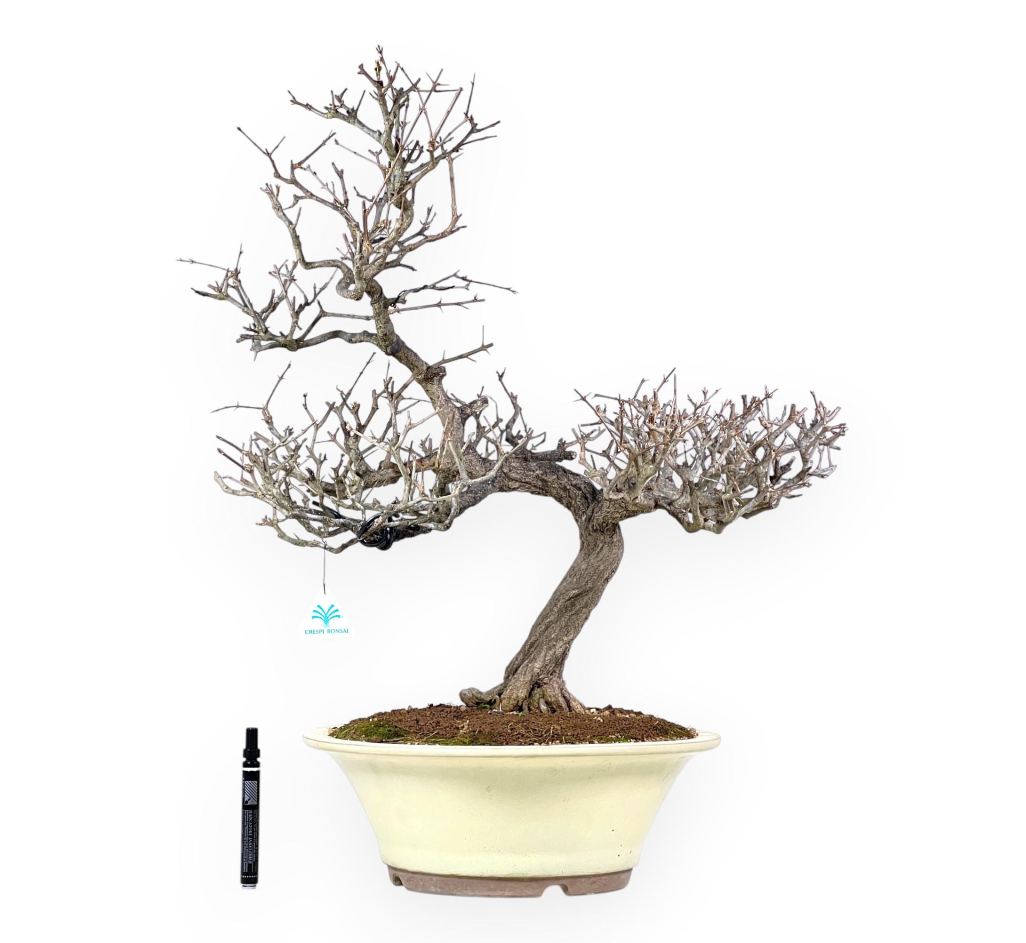 Bonsai van granaatappel met een hoogte zonder pot van 57 cm en een stamomvang van 3,5 cm en nebari van 12 cm. De plant wordt gekweekt in een rond pot van geglazuurd steengoed met afmetingen Ø36xH13 cm.