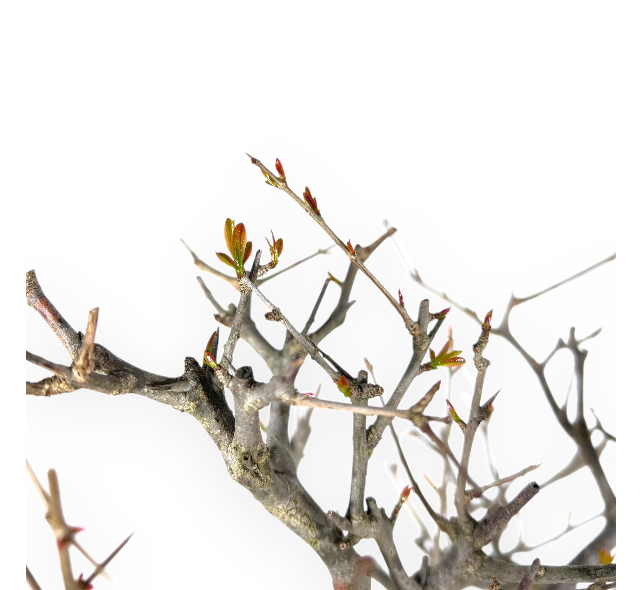 Bonsai van Punica granatum (granaatappel), een bladverliezende fruitboom, die gewaardeerd wordt om zijn vermogen om elegantie, rustiek en seizoensgebonden spectaculaire te combineren. De bladeren, klein en lancetvormig, verschijnen in de lente met zeer decoratieve rood-bronzen jonge scheuten die heldergroen zijn tijdens het groeiseizoen, dan warme geel-oranje tinten aannemen in de herfst voordat ze vallen. Tijdens de winter verliest de plant zijn bladeren volledig, waardoor de elegante structuur van de stam en de takken benadrukt wordt. Tussen het late voorjaar en de zomer produceert hij helder oranjerode bloemen met een karakteristieke en zeer decoratieve vorm. Als de plant onder de juiste omstandigheden wordt gekweekt, worden de bloemen gevolgd door vruchten, granaatappels, die tegen het einde van de zomer/herfst rijpen en de plant nog meer esthetische waarde geven. Gekweekt in een rond crème geglazuurd steengoed pot, contrasteert elegant met de tinten van het gebladerte en de bloemen, waardoor hun schoonheid wordt benadrukt.