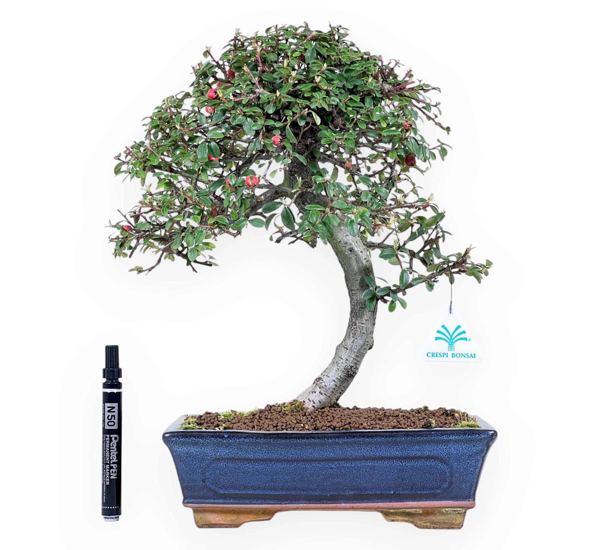 Bonsai van Cotoneaster coral beauty (cotognastro), bladverliezende fruit soort, en is geliefd in de bonsai wereld vanwege zijn compacte groei, dichte vertakking en kleine, ovale, glanzende, intens groene bladeren. In het voorjaar wordt hij gewaardeerd om zijn kleine witroze bloesem. In de herfst en winter kleurt het blad rood en versiert de plant zich met talrijke rode bessen, die decoratief en duurzaam zijn, de seizoensgebonden charme versterken en hem ook perfect maken als sierfruit bonsai. Gekweekt in een rechthoekige blauw geglazuurd steengoed pot, vormt deze plant een mooi contrast met het heldere groen van de bladeren en het felrode van de bessen.
