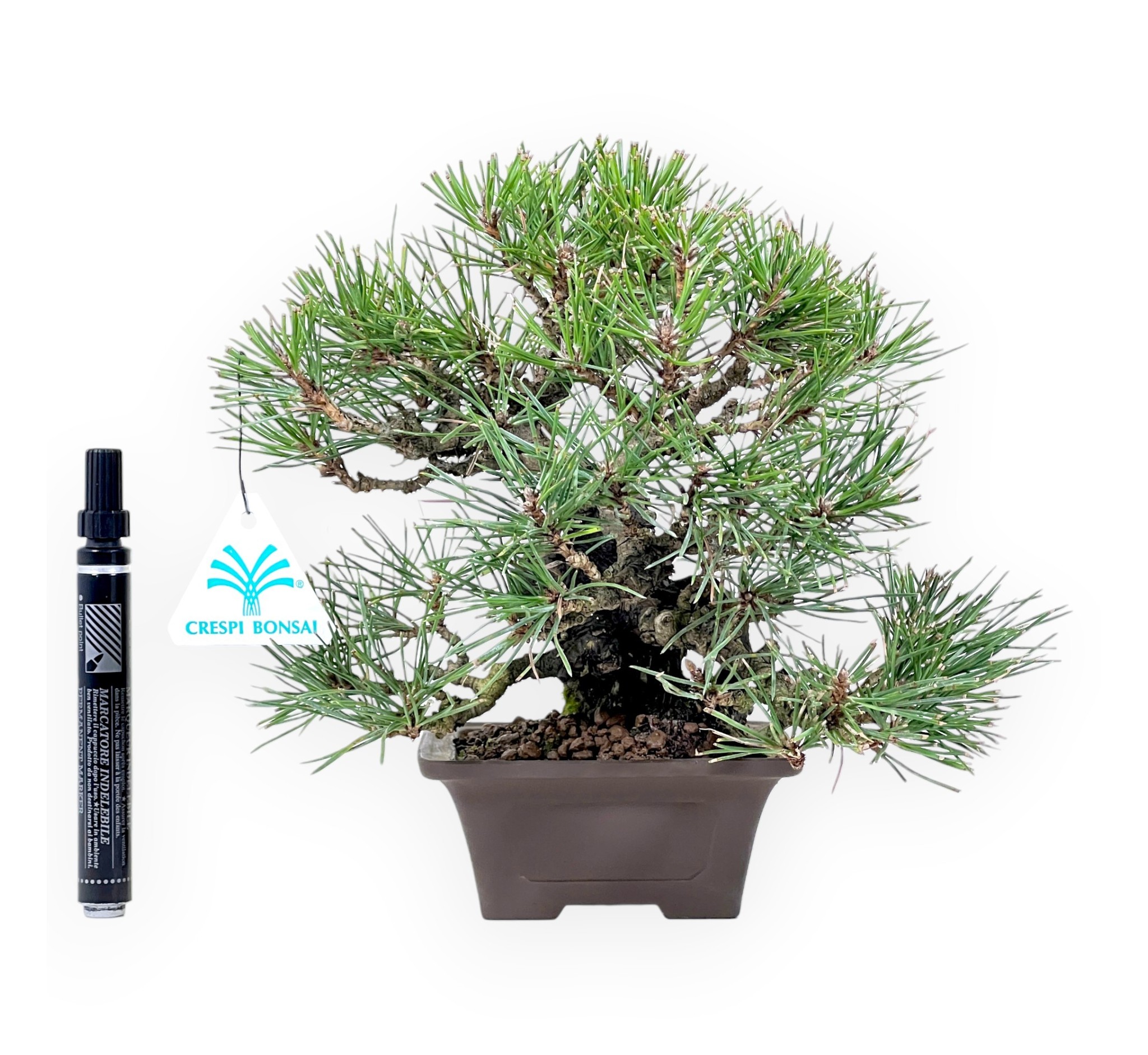 De shohin bonsai van Pinus thunbergii (zwarte den), een groenblijvende naaldboom, is robuust en zeer gewaardeerd om zijn ruwe bast en krachtige naalden. Het gebladerte is dicht en bestaat uit dubbele, lange, dunne, heldergroene naalden. De rijpe, ruwe schors barst naarmate hij ouder wordt, waardoor hij steeds interessanter wordt. Gekweekt in vierkant pot van ongeglazuurd steengoed, versterkt het kleurcontrast en versterkt de natuurlijke esthetiek van de bonsai.