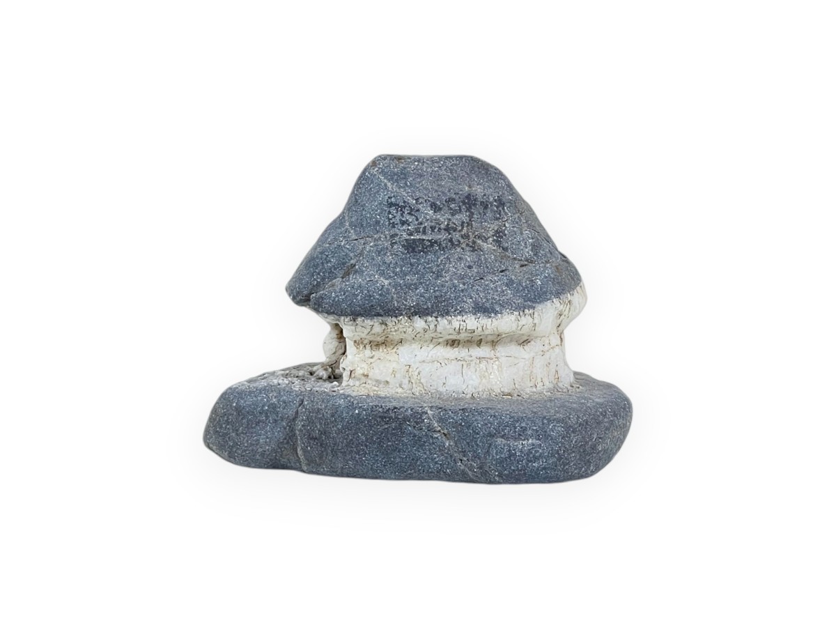 Deze Japanse suiseki heeft een natuurlijke vorm die doet denken aan een kleine hut: het donkergrijze, conische bovendeel doet denken aan een schuin dak, terwijl de lichtere centrale band, de muren van de hut suggereert. Een holte aan de voorkant doet denken aan een ingang of een raam, wat de gelijkenis met een landelijke woning nog benadrukt.