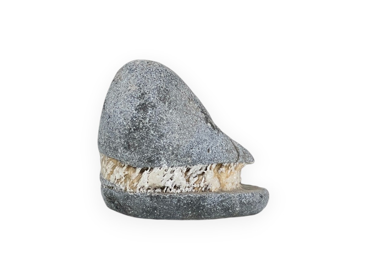 Deze Japanse suiseki heeft een natuurlijke vorm die doet denken aan een kleine hut: het donkergrijze, conische bovendeel doet denken aan een schuin dak, terwijl de lichtere centrale band, de muren van de hut suggereert. De donkergrijze kleur met lichtere aders geeft diepte en natuurlijkheid aan het geheel en versterkt de indruk van een landelijke scène ondergedompeld in de stilte van het verleden.