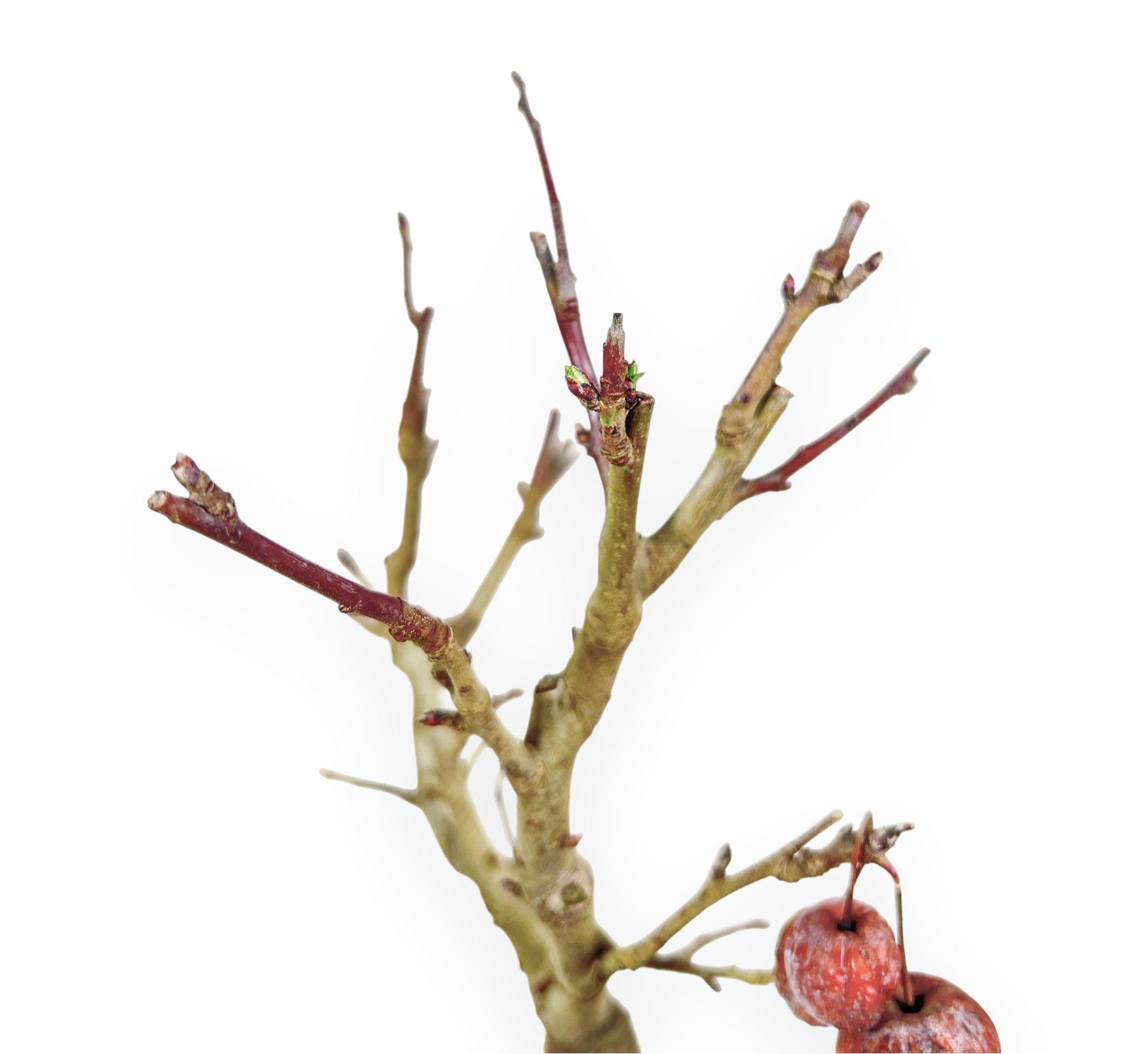 Deze werkplant van Malus (appelboom), bladverliezende fruitbomen, en wordt gewaardeerd om zijn witroze bloei in het voorjaar en de daaropvolgende productie van kleine appels, die van groen-geel naar rood verkleuren wanneer ze rijp zijn, wat de boom karakter geeft. Het blad kleurt oranje-geel in de herfst en valt af in de winter. Het is een groeiende en vormende plant, met een luchtige structuur en golvende vormen, gekweekt in een bruin rond plastic pot.