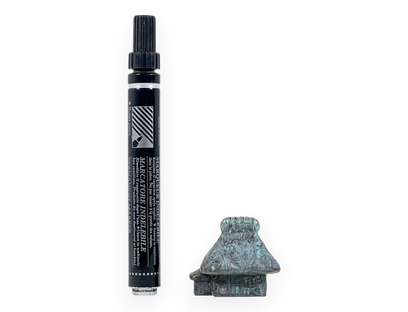 De tenpai, gemaakt van brons met gepolijste groenblauwe tinten, stelt een kleine hut voor. Geïnspireerd door traditionele Japanse plattelandswoningen, kan het landelijke landschappen en traditionele sferen suggereren in een displaycompositie. Het kleine formaat maakt het perfect voor kleine en middelgrote bonsaiboompjes. Het is ideaal om een tokonoma of presentatietafel te verrijken met elegantie en samenhang.
